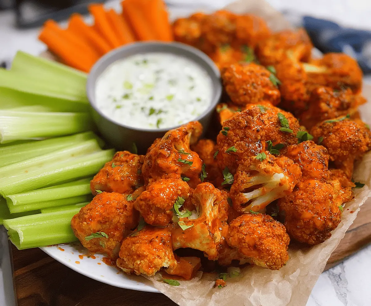 Transfer the buffalo cauliflower to a serving plate. Sprinkle fresh chopped parsley or green onions on top for a pop of color and fresh flavor. Serve with celery sticks and ranch or blue cheese dressing on the side to balance the spicy kick.