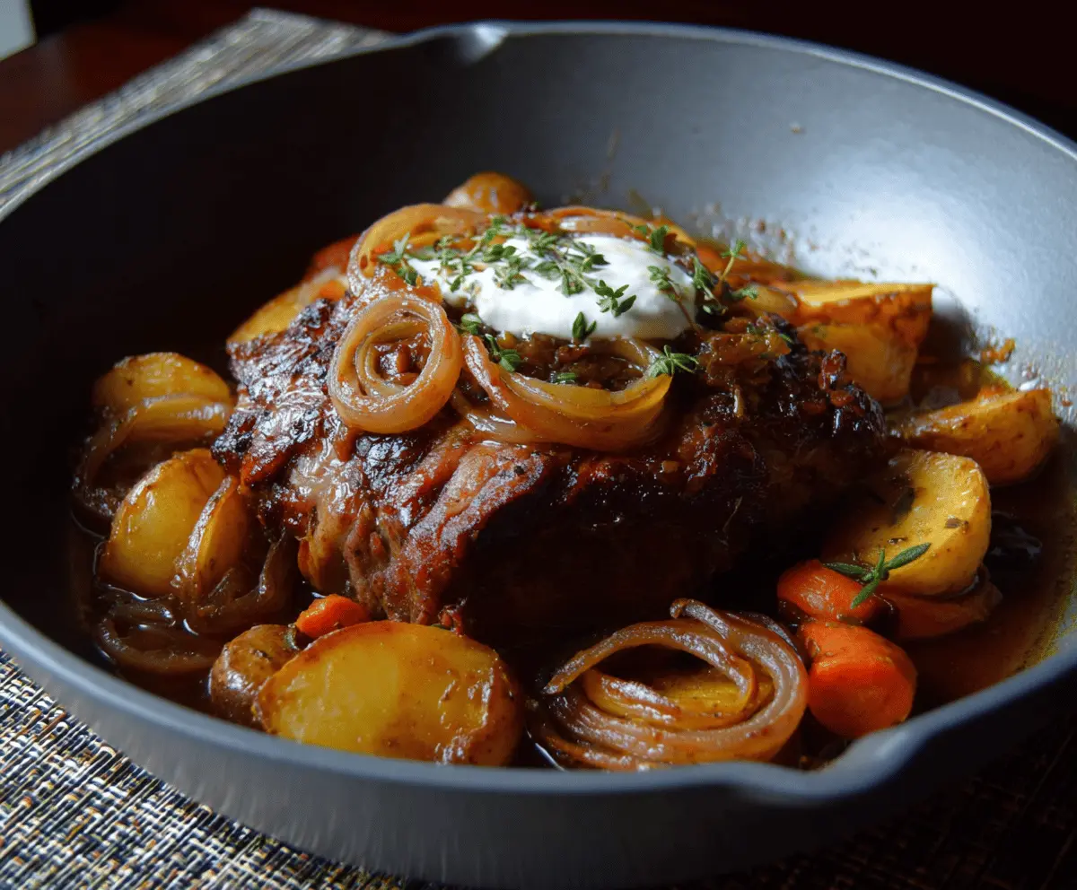 Slice or shred the pork. Spoon some of the thickened apple-onion sauce over the top. Garnish with fresh thyme sprigs and, if you like, add a dollop of sour cream or crème fraîche for a creamy touch. Enjoy!