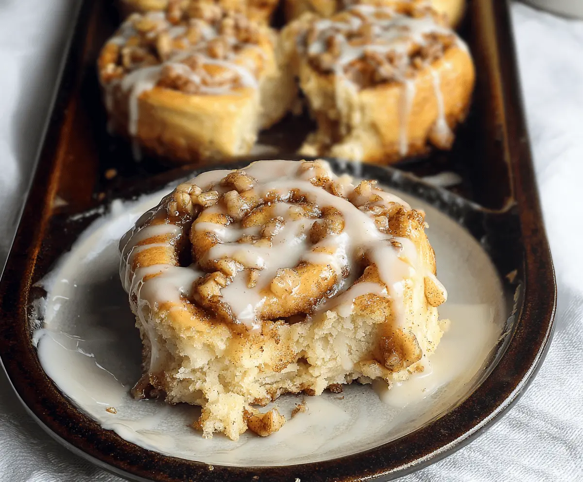 Remove the baked rolls from the oven and immediately drizzle the glaze on top while they’re still warm. Sprinkle additional chopped nuts if you like. Let the rolls cool slightly before serving—enjoy the warm, gooey, apple-packed cinnamon rolls!