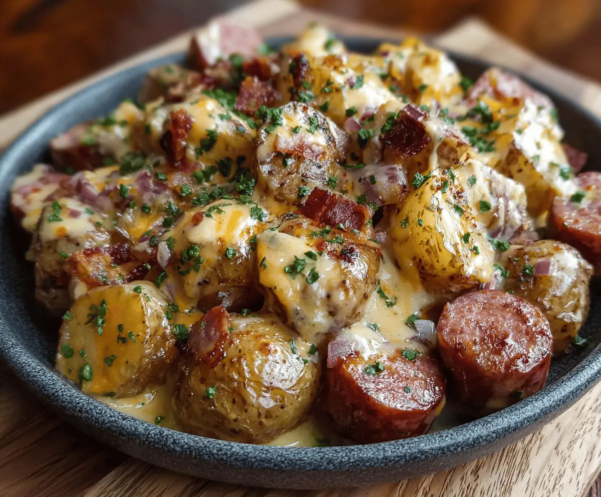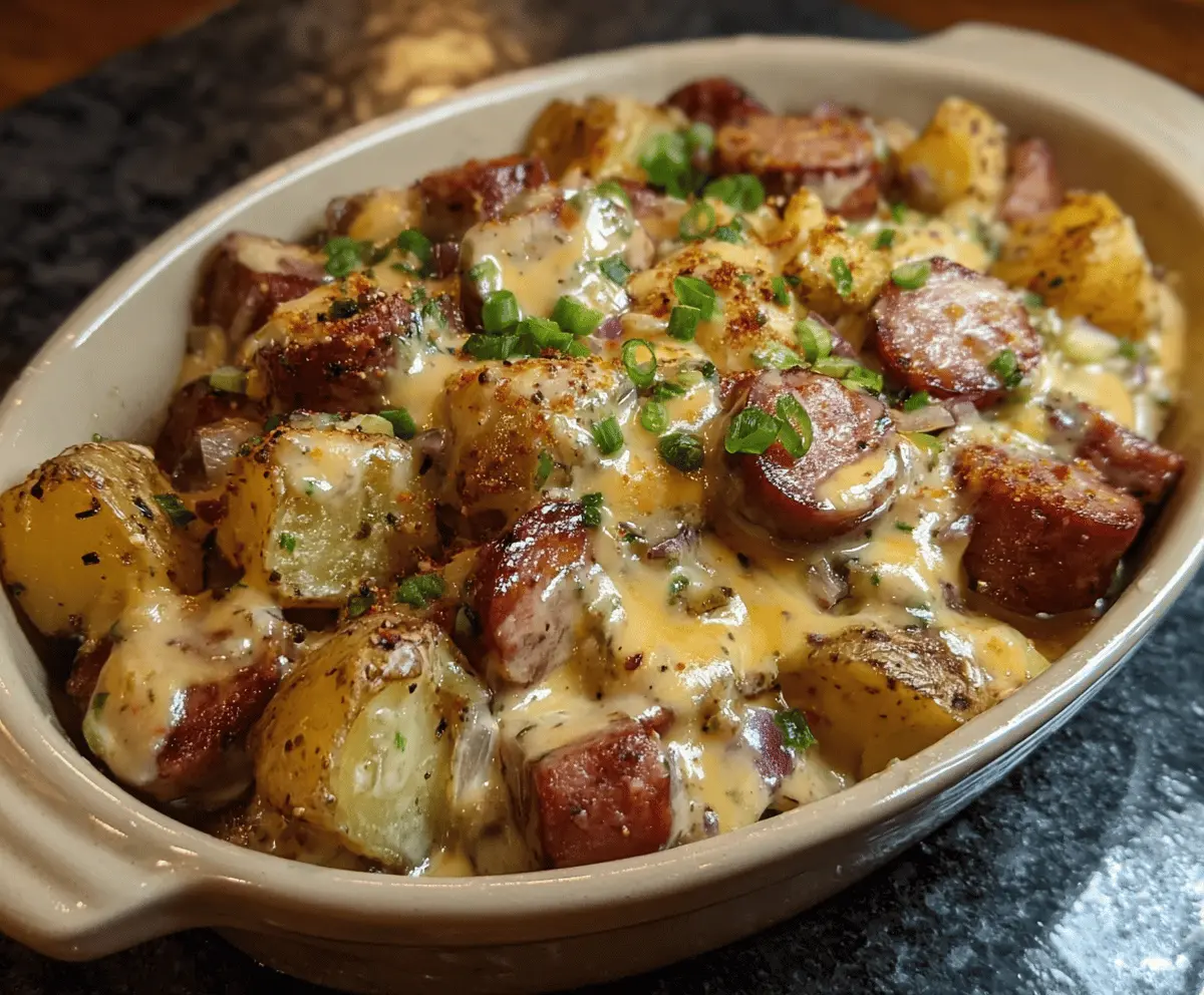 Cheesy Ranch Potatoes and Smoked Sausage is a hearty, comforting dish that’s packed with flavor. The crispy potatoes tossed in ranch seasoning pair perfectly with the smoky, juicy sausage, all topped off with melted cheese that brings everything together in a warm, delicious way.