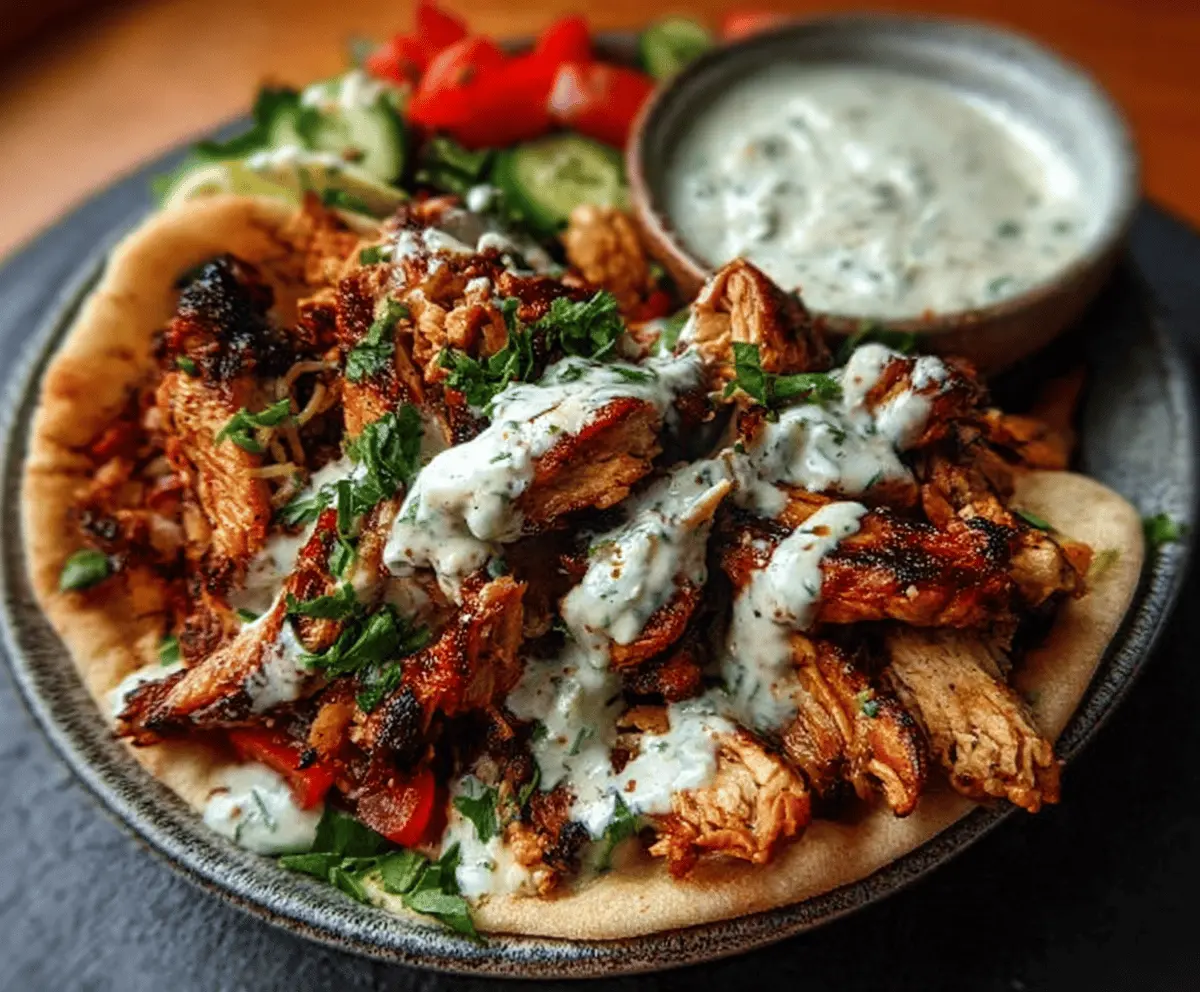 Warm the pita or flatbread. Arrange the sliced chicken on top, then spoon good amounts of the creamy garlic sauce over it. Add fresh tomatoes, cucumbers, and a sprinkle of herbs for freshness. You can eat it open-faced or wrap it up like a sandwich.