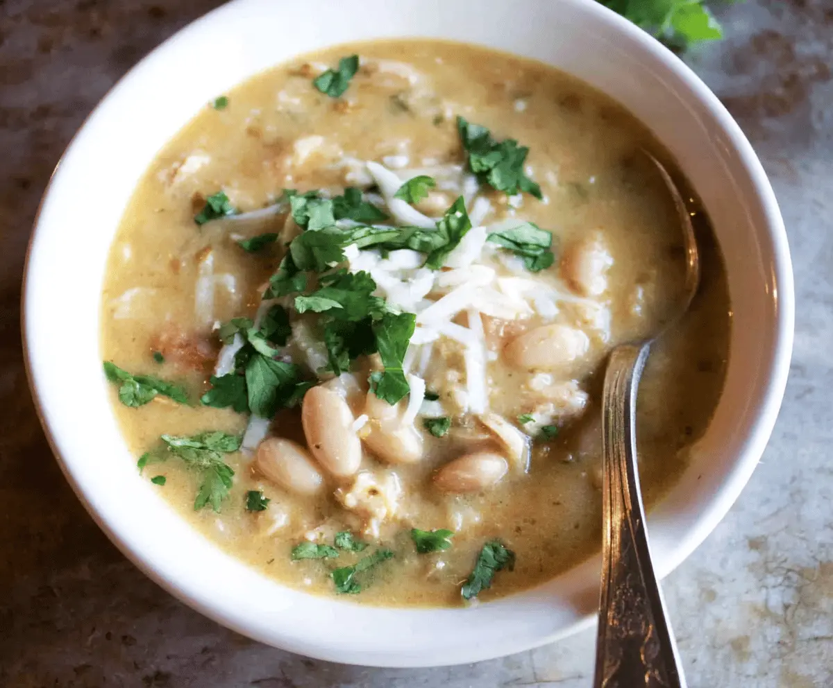 Creamy White Bean Enchilada Soup in a bowl topped with cheese, cilantro, and sour cream, served with tortilla chips on the side.