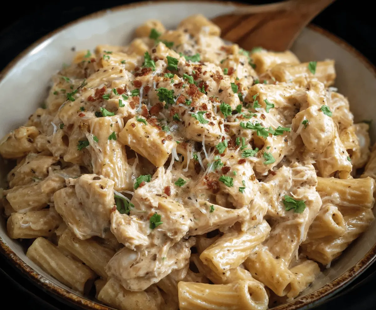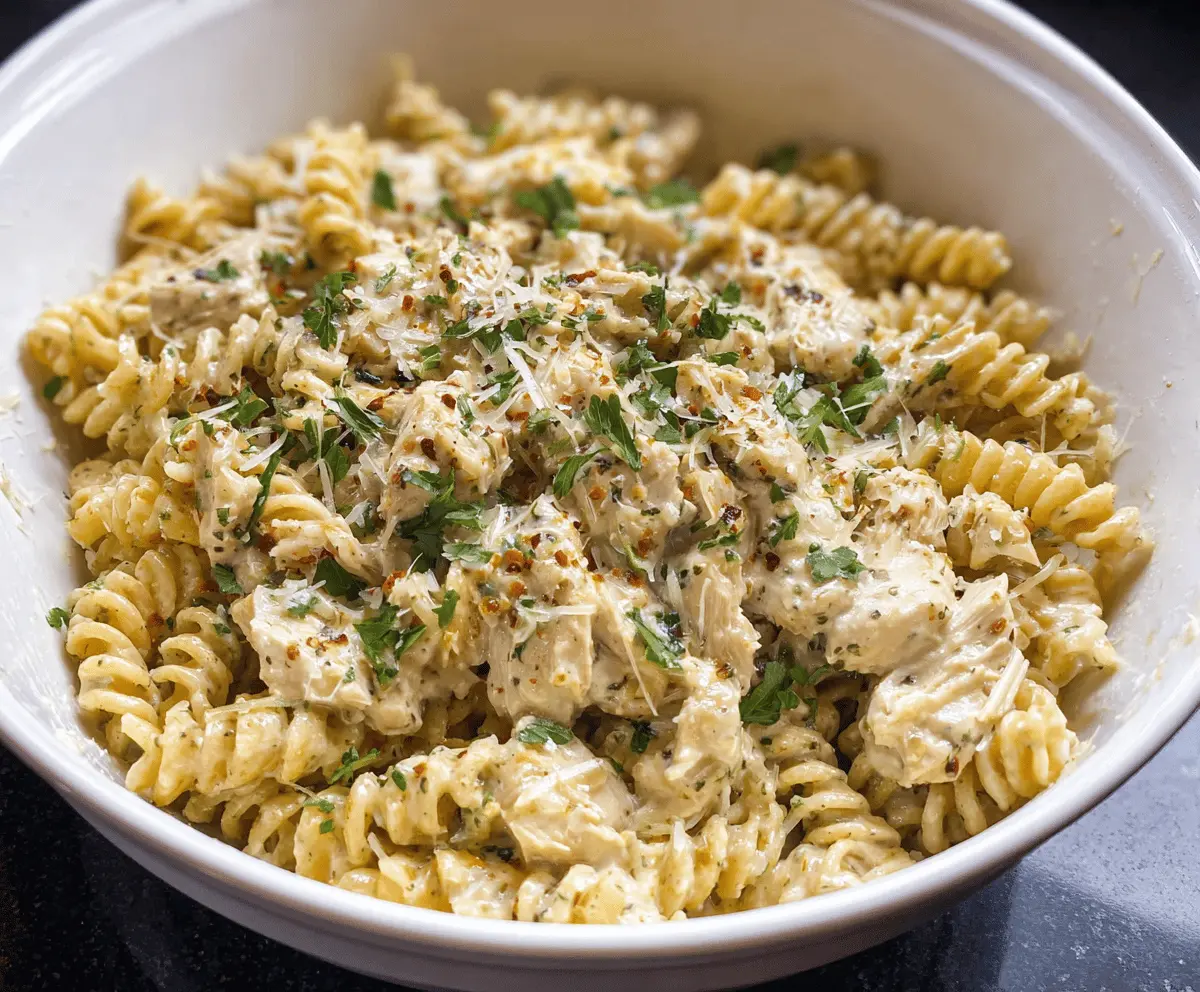 Creamy crockpot garlic parmesan chicken pasta dish garnished with fresh herbs in a bowl