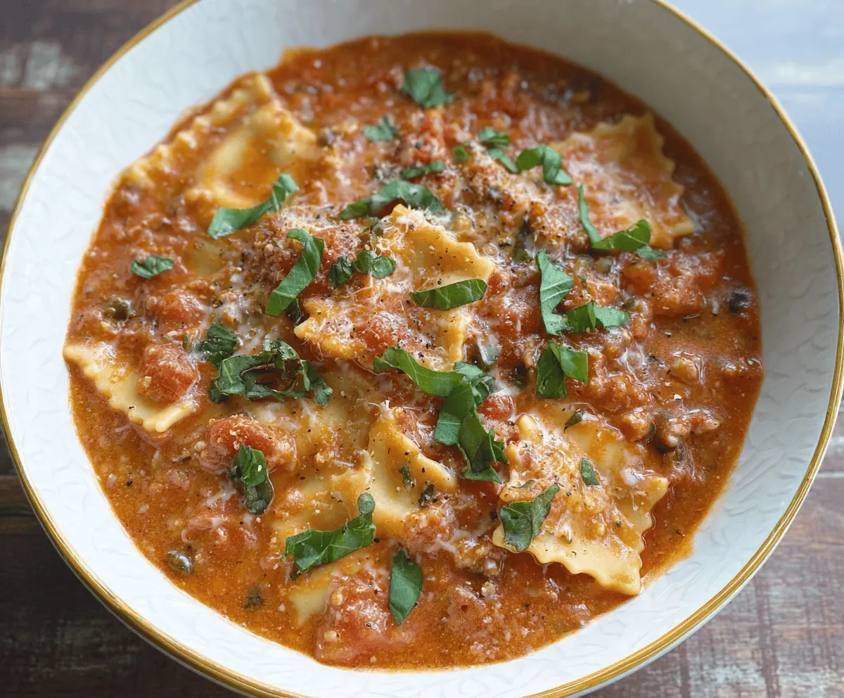 Add the chopped lasagna noodles or ravioli into the simmering soup. Cook for about 8–10 minutes or until the pasta is tender but still firm (al dente). If you’re using dairy-free ricotta or crumbled tofu to mimic lasagna filling, gently stir it in during the last 5 minutes to warm it without breaking it apart.