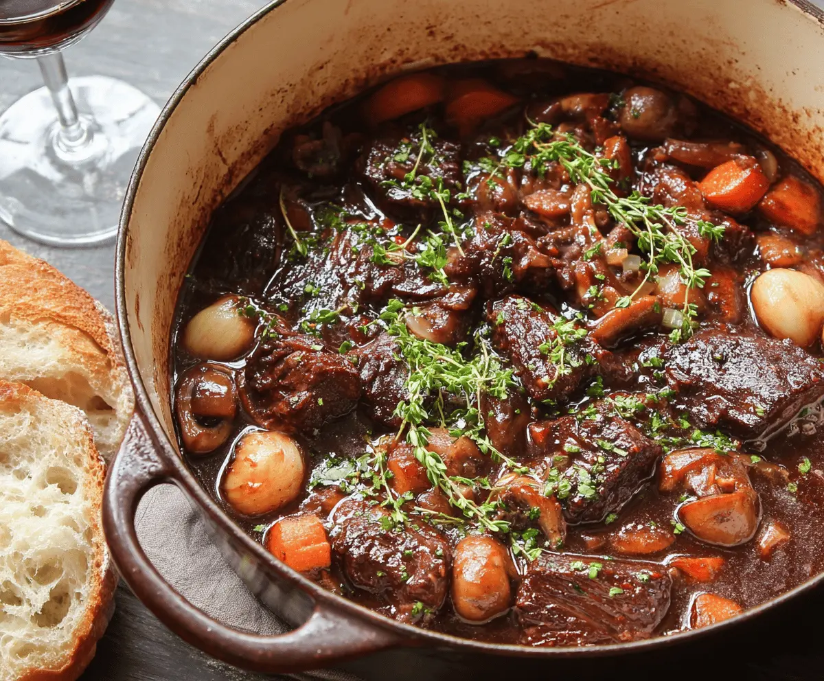 French Beef Bourguignon is a classic hearty stew that’s packed with tender chunks of beef, slow-cooked with red wine, mushrooms, onions, and carrots. It’s the kind of meal that feels like a warm hug after a long day, with rich flavors that deepen the longer it simmers. The combination of the wine and herbs creates a beautifully cozy and comforting dish.