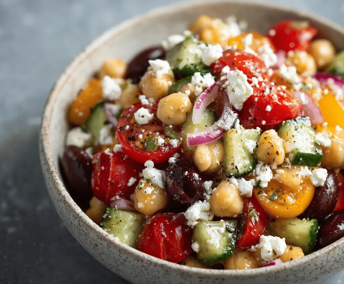 This Greek Chickpea Salad is bright, fresh, and incredibly satisfying — a perfect blend of crunchy vegetables, creamy feta, hearty chickpeas, and zesty Greek-inspired dressing. It’s a wholesome, protein-packed salad that works beautifully for lunches, meal prep, healthy sides, or light dinners. Every bite bursts with Mediterranean flavor, thanks to juicy tomatoes, crisp cucumber, tangy olives, red onion, and fragrant herbs.