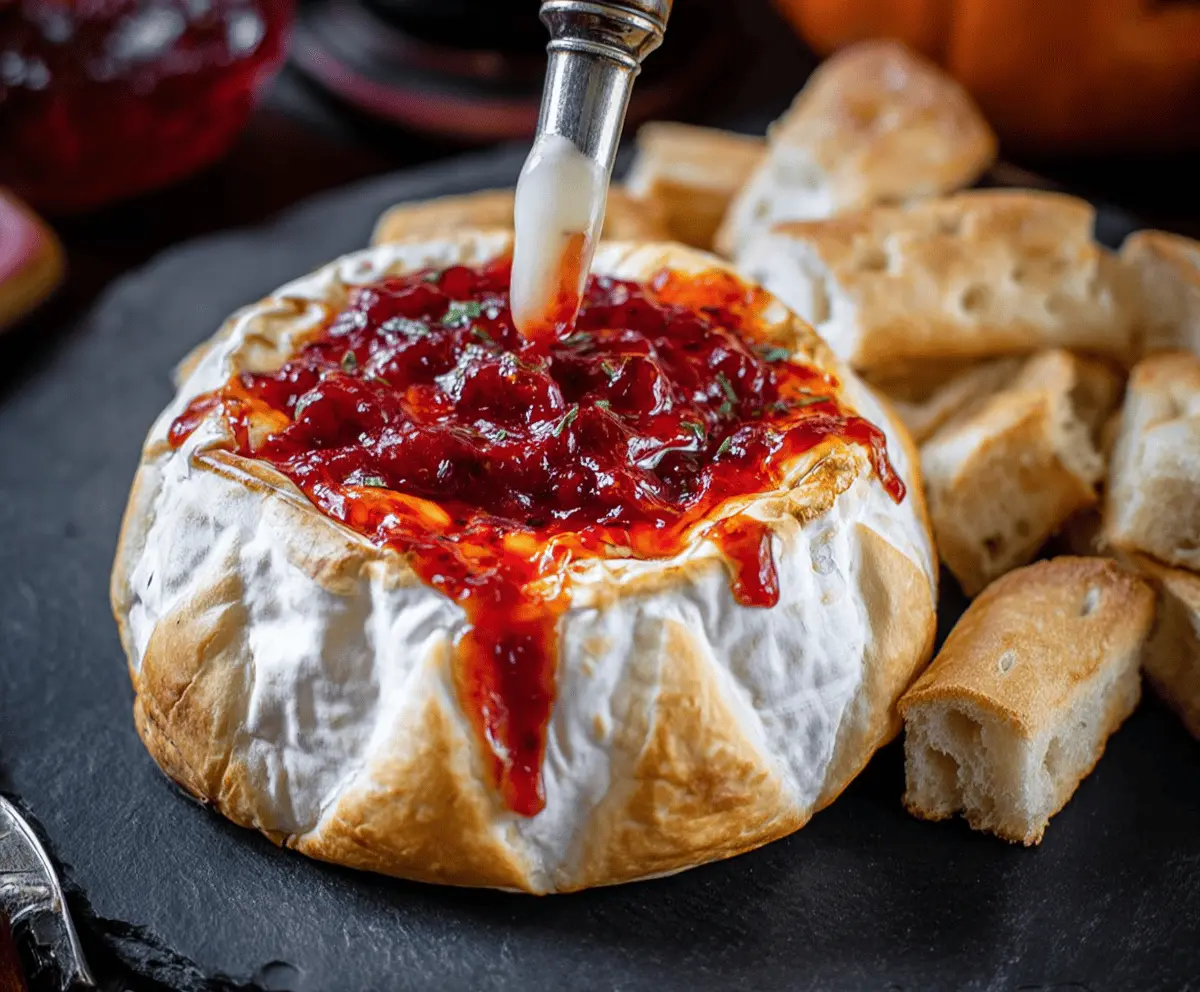 Halloween Red Baked Brie is a festive and delicious twist on a classic cheese treat that’s perfect for spooky season! This melted Brie is topped with a rich red fruit spread, giving it a vibrant color that looks just like Halloween blood. The creamy, gooey cheese pairs wonderfully with the sweet and tangy red topping, making it a fun and tasty appetizer that everyone will love at your Halloween gathering.