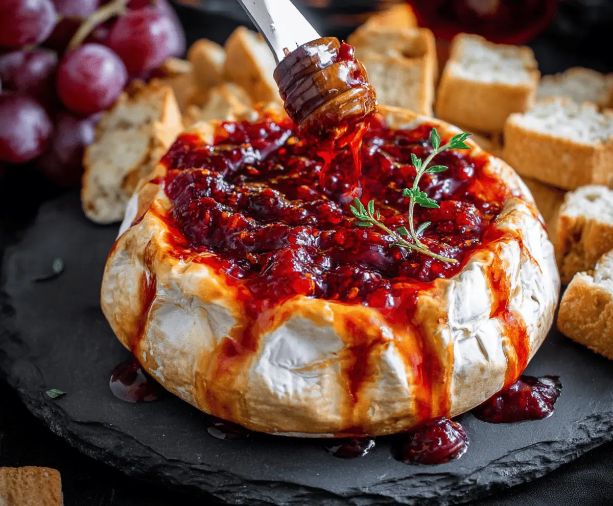 I love making this because it’s so easy yet feels extra special. I usually wrap the Brie in puff pastry to add a nice crispy layer, then bake it until golden and melty. The red fruit topping—whether it’s cranberry, raspberry, or strawberry jam—adds that perfect pop of color and flavor. Plus, it’s fun to get creative by sprinkling some festive herbs or nuts on top for a little extra crunch and character.