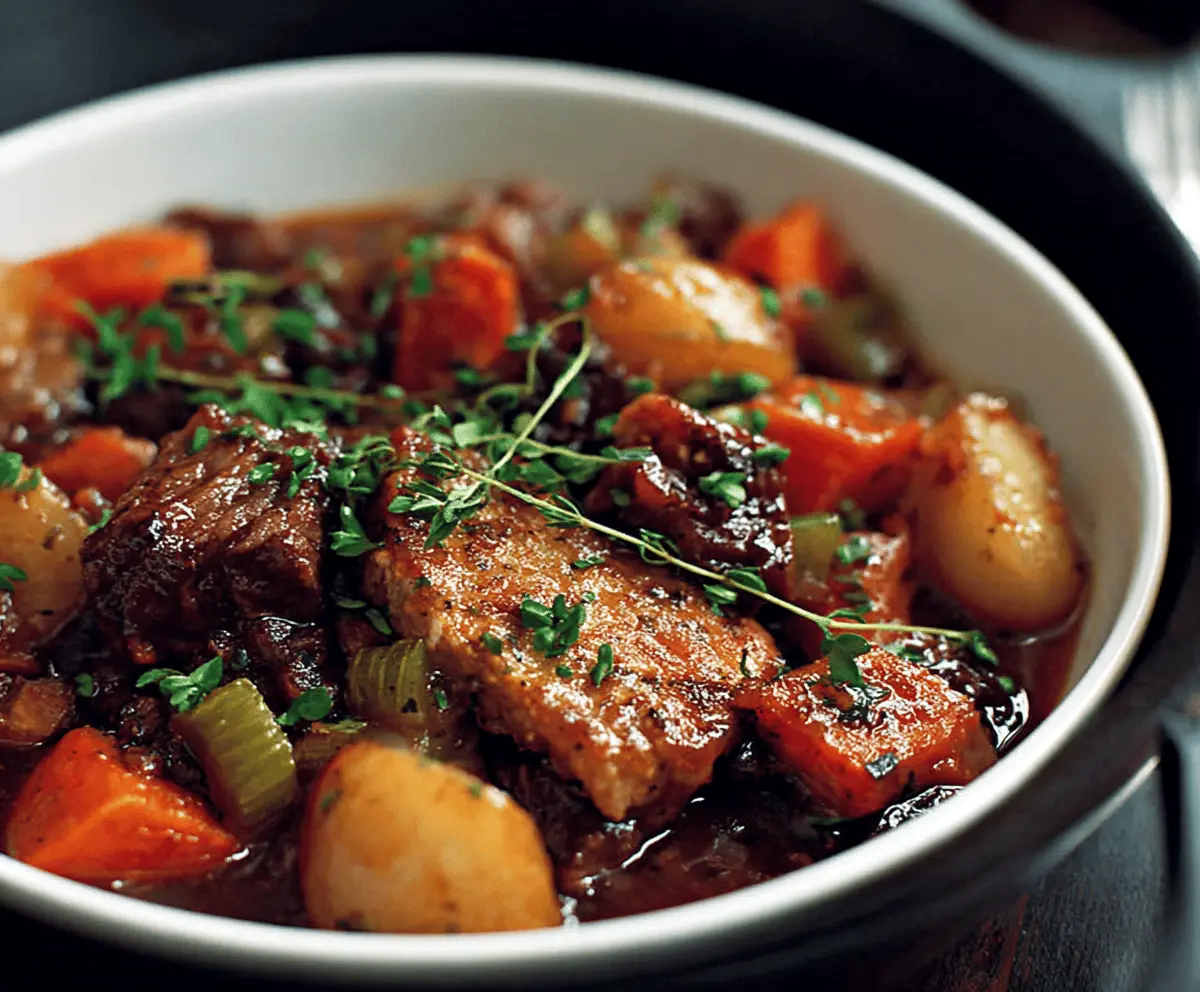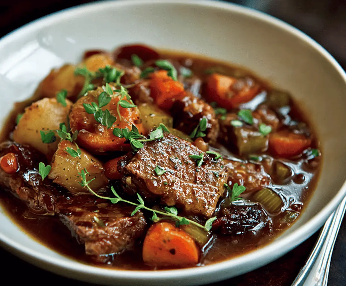 Remove the bay leaf and any thyme sprigs before serving. Spoon the hearty stew into bowls and garnish with fresh parsley or thyme. It’s wonderful served with crusty bread or creamy mashed potatoes for a comforting meal.