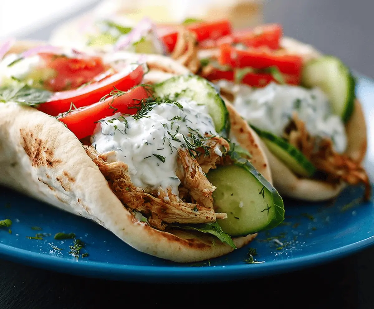 Lay a warm pita flat on a plate. Spoon a generous amount of shredded chicken into the center, then add sliced red onion, tomatoes, cucumbers, and a big dollop of tzatziki sauce. Sprinkle with fresh parsley or cilantro for a burst of color and flavor.