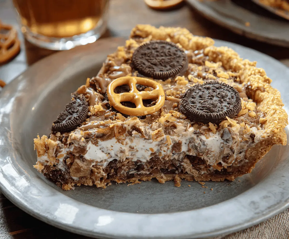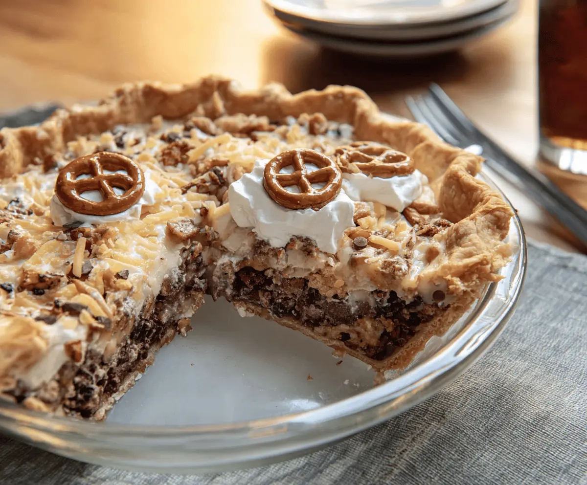 Before serving, decorate the top with whole pretzels and cookies for a fun look. Slice the pie, serve chilled, and enjoy the yummy mix of crunchy, creamy, sweet, and salty in every bite!