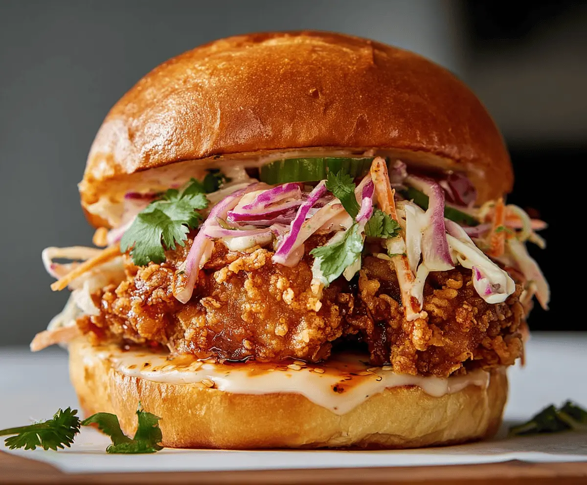 The Thai Fried Chicken Sandwich is a perfect mix of crispy, tender chicken with a punch of bold, zesty flavors. The crunchy coating gives way to juicy chicken inside, while the vibrant Thai-inspired sauce adds a tangy and slightly spicy kick that makes this sandwich stand out from the usual fried chicken routine.